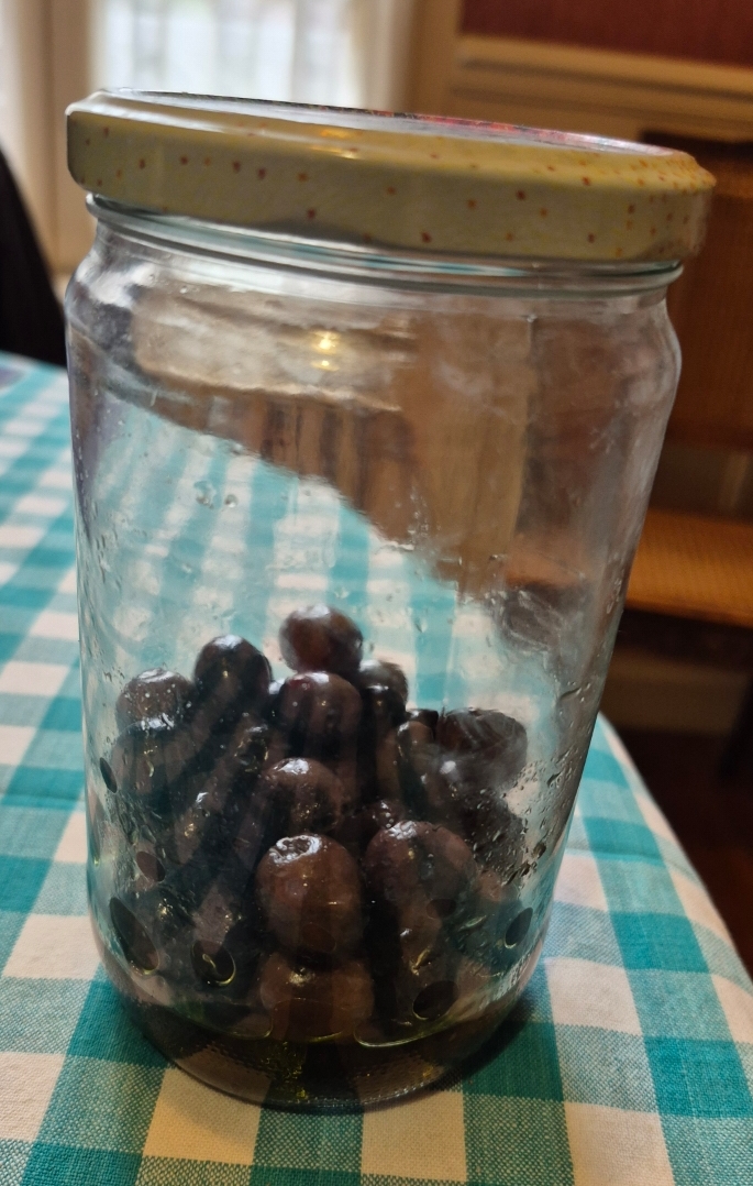 L’image peut sembler dérisoire. C’est pourtant la première récolte transformée et mangeable que j’ai pu mener à bien en cette année 2025. L’an prochain ce sera mieux en attendant que les deux oliviers du jardin vieillissent et produisent plus. Je crois avoir acquis le savoir permettant d’éliminer l’amertume et de terminer par la saumure…