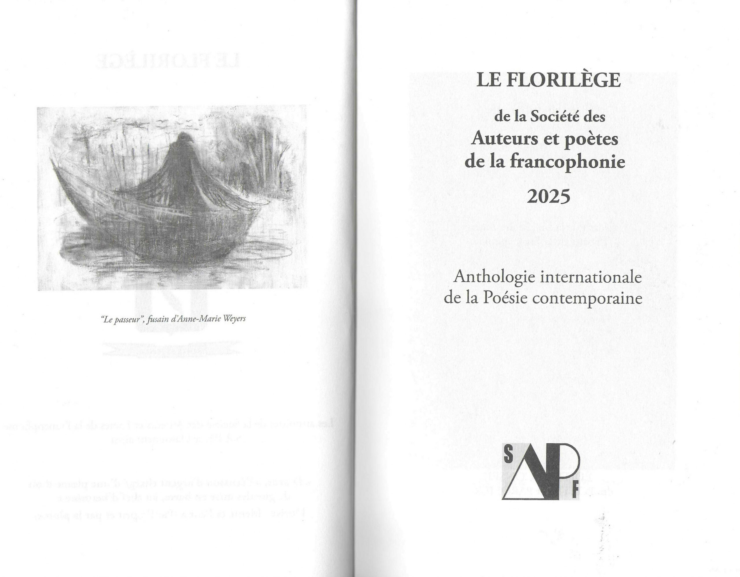 Chaque année la Société des Auteurs et Poètes de la Francophonie, publie un florilège, ouvrage soigné et précieux. J’y présente un ou deux poèmes. L’ouvrage actuel est conçu depuis dix ans par le présient de l’association, Jean-Charles Dorge à la suite d.O. Furon Bazin. JC Dorge est un poète éminent qui vient d’éditer un nouveau recueil Fleurs de réveil, ce que nous apprend le Florilège. L’ouvrage, outre le mot du Président suivi des actualités de l’associaition, comprend un grand nombre de poèmes (avec un bref portait de chaque poète, dont ceux de Coréens), et offre des Chroniques, des Opinions libres, des présentations de concours, et une rubrique : Lu pour vous. L’ouvrage est illustré par de multiples artistes dont votre serviteur (j’avais donné en début septembre la primeur d’un des dessins à mes lecteurs).