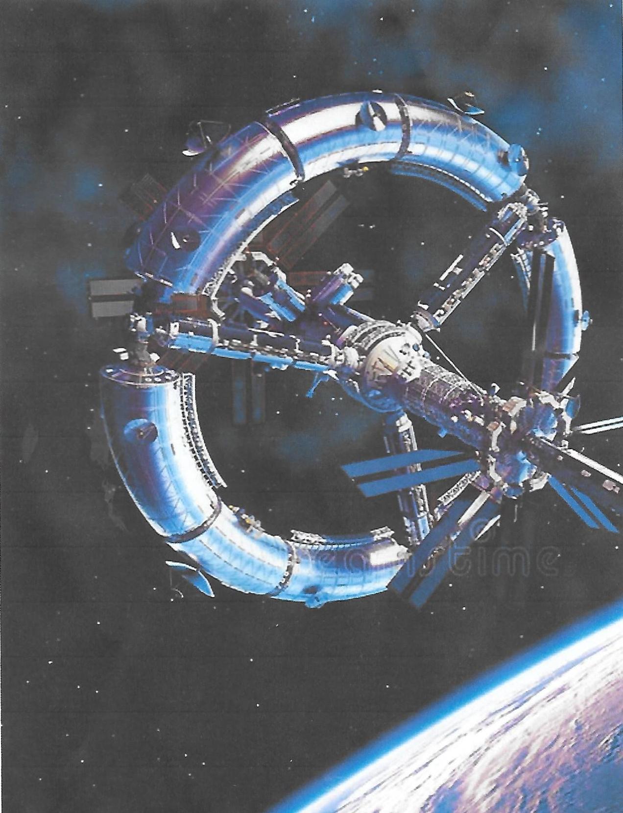 C’est une station orbitale qui comme son nom l’indique a une forme de roue. La zone-vie se trouve sur la périphérie de la roue. La roue tourne autour de son axe pour créer une gravité artificielle. Les hommes circulent sur le pourtour, la tête tournée vers le centre de la roue. Si la vitesse de rotation décroît, les rétrofusées peuvent donner un petit coup de pouce. Ce sont d’ailleurs elles qui ont donné l’impulsion initiale. La zone-vie de la station occupe les 9/10e de la circonférence, la zone technique le reste. Elle comprend les cellules des condamnés , la cafétéria, les salles de sport, les serres pour les légumes et les fruits, les bassins de petits poissons qui se nourrissent des déchets et excréments, les réacteurs d’algues, plus particulièrement les réacteurs de spiruline. Cette cyanobactérie se nourrit du CO2 des occupants et le convertit en oxygène, elle a aussi l’immense avantage de produire des protéines riches. A elles seules ces dernières sont insuffisantes pour nourrir les occupants, il faut compléter avec des oméga 3 et de la vitamine C, c’est le rôle des serres et bassins. Au total l’écosystème fonctionne bien, il a été testé sur les premières colonies martiennes à la fin du 21e siècle. Des panneaux s’ouvrent et se ferment pour simuler le jour et la nuit.